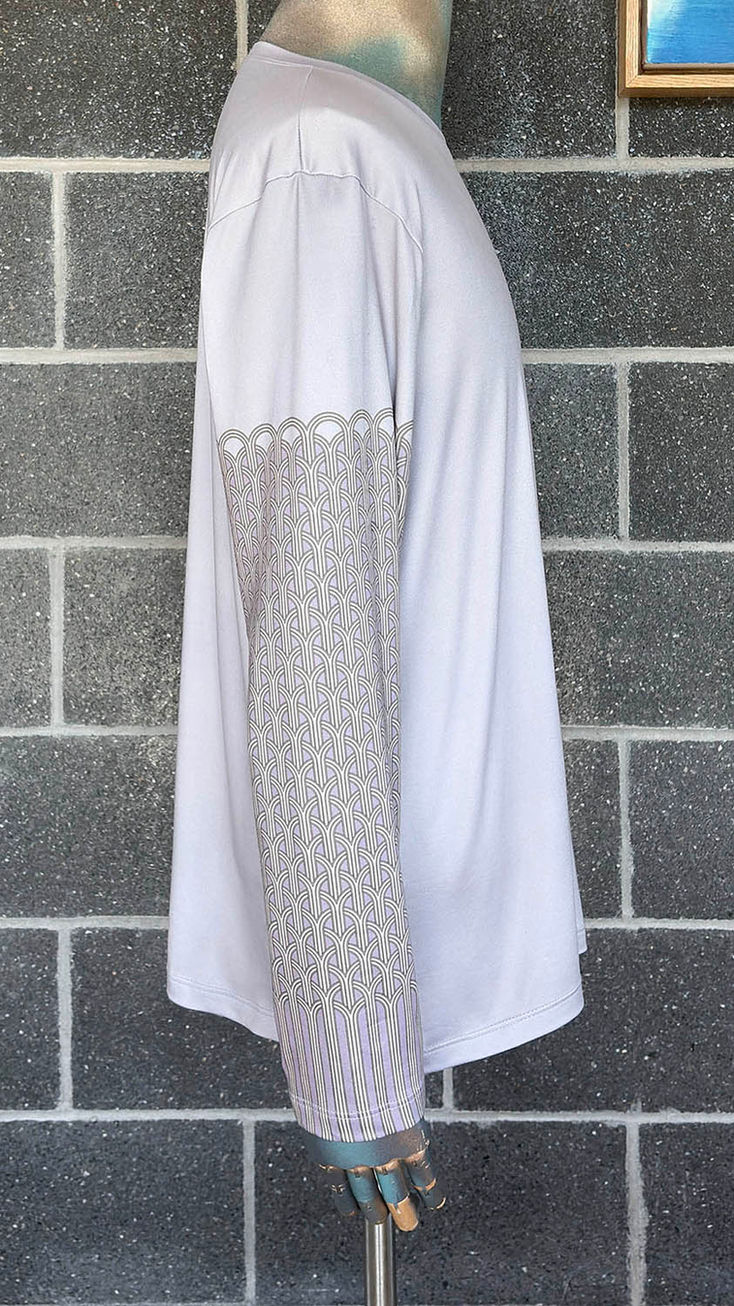 This design started with the idea of making the sleeve the hero. I created a beautifully complex pattern in an architectural drafting program and then colored the design in Photoshop. Most of the shirt is grey which is actually a blurred photograph of concrete, so there are tonal variations in the grey. From some angles the shirt seems simple, but when viewing the decorative arm graphic, it becomes an incredibly bold shirt design. This shirt is for people with a confident style.